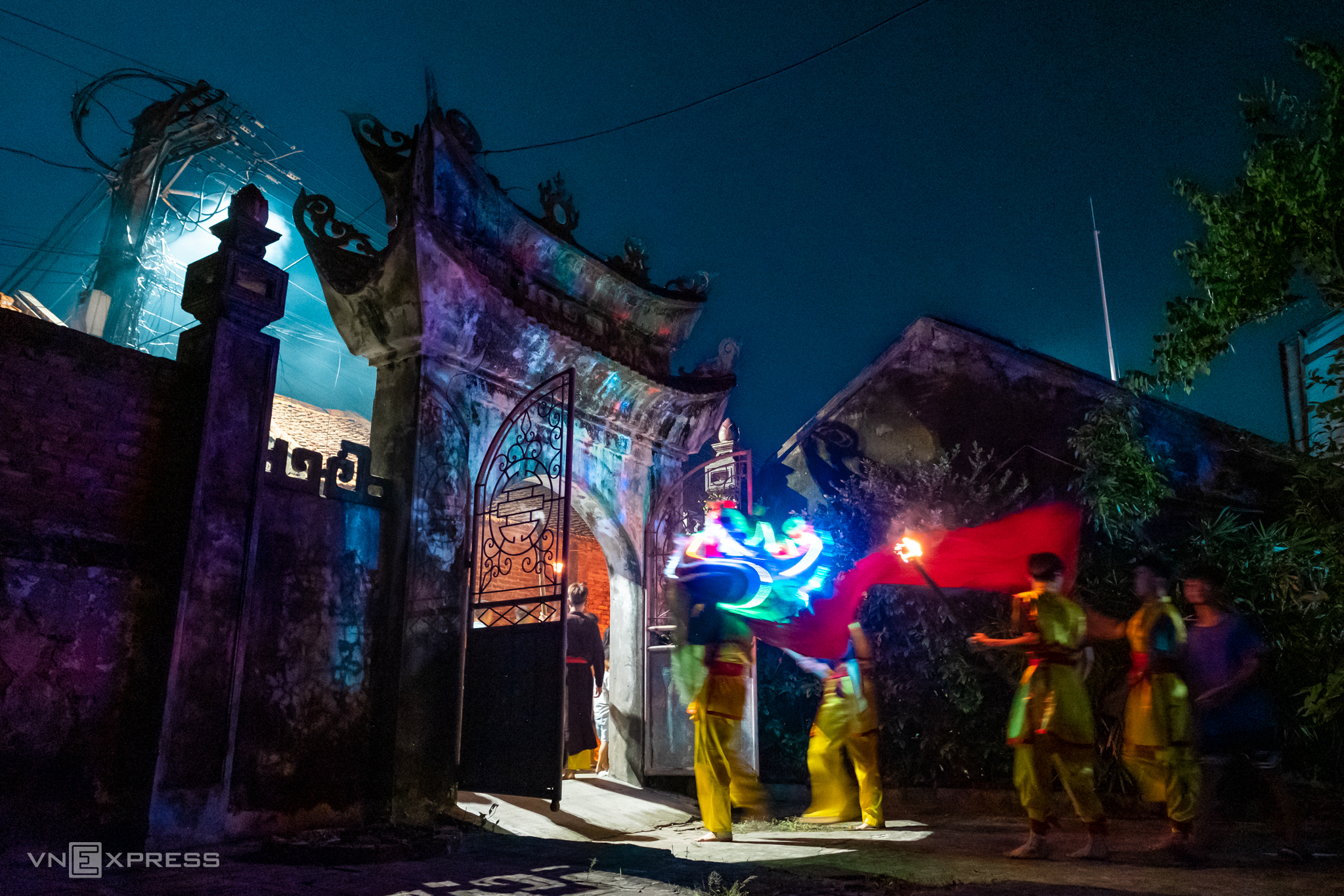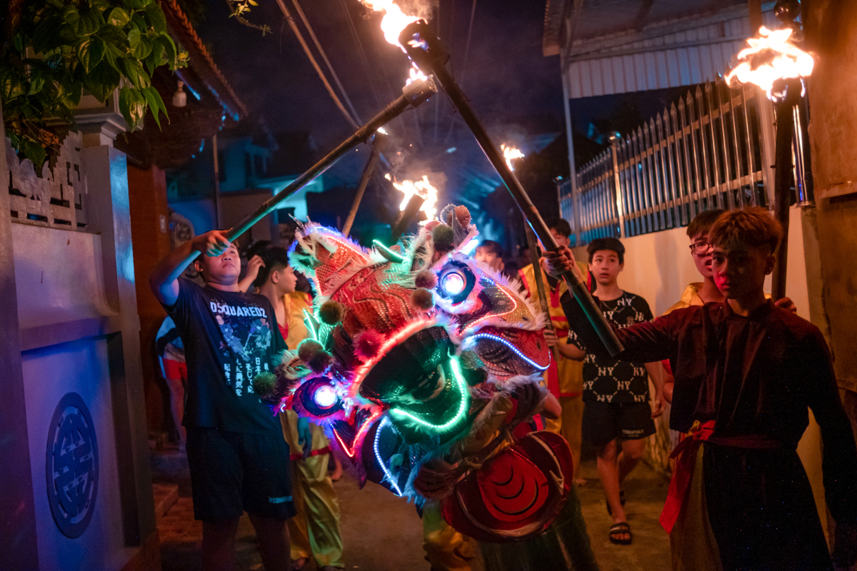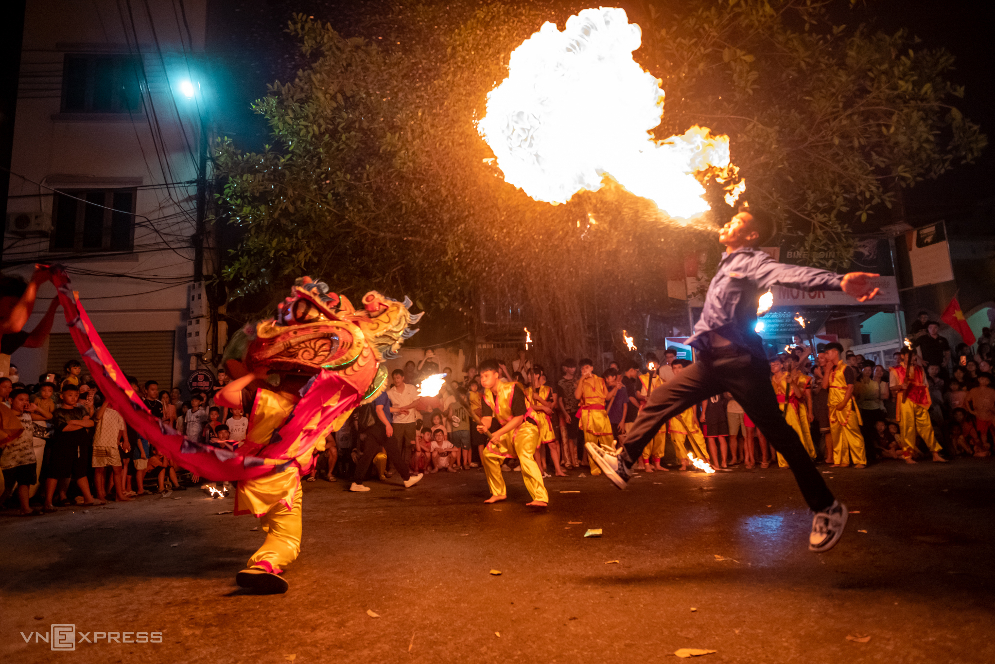 Hàng chục thanh niên thôn Cao Hạ, xã Đức Giang, huyện Hoài Đức múa lân, thổi lửa, đi vòng quanh làng, khuấy động không khí đêm Trung thu truyền thống.