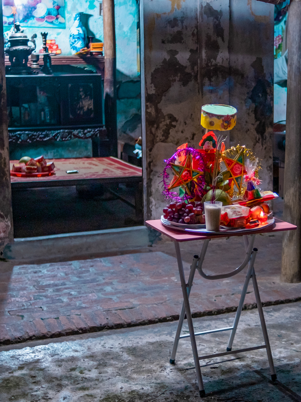 Em nhỏ được mẹ chụp hình bên mâm cúng Trung thu đặt ở đầu thôn Cao Hạ.